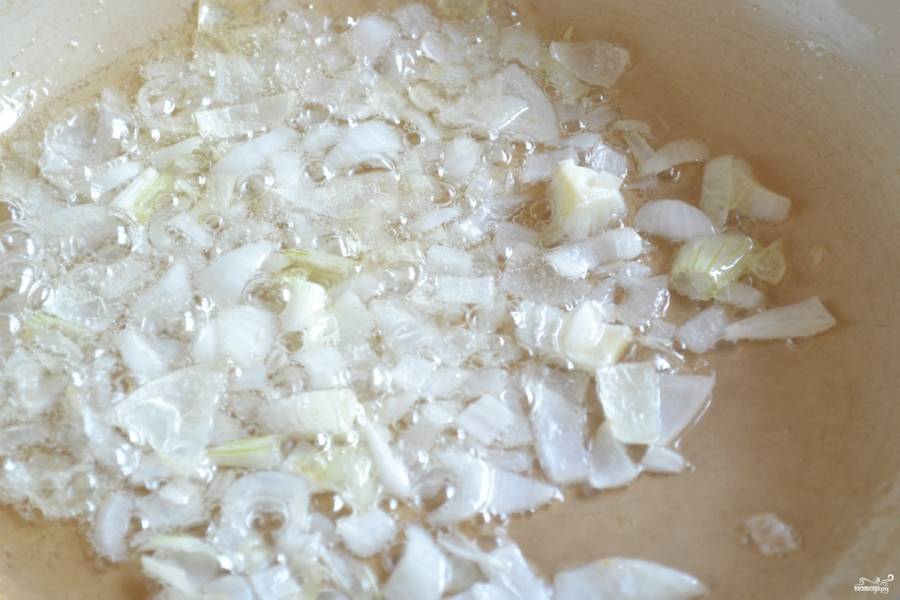 В сковороду налейте растительное масло, хорошо нагрейте. Высыпьте измельченный лук. Пассеруйте до тех пор, пока он не станет прозрачным.
