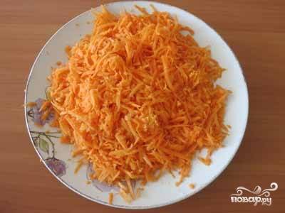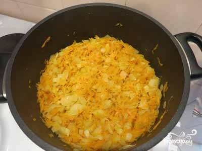 Когда лук начнет румяниться, добавляем морковку. Перемешиваем и обжариваем все вместе минут 15.