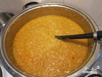 Как только икра закипит, уменьшайте огонь - при бурном кипении она будет "плеваться". Икра должна у нас увариваться 1 час. Прикройте кастрюлю крышкой наполовину - пусть испаряется лишняя жидкость и не забывайте ее перемешивать - может пригореть.