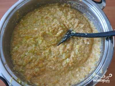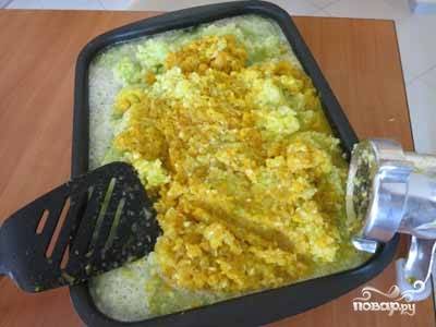 Кабачки измельчим на мясорубке с мелкой решеткой, вместе с кабачками перекрутим и обжаренные лук с морковью.
