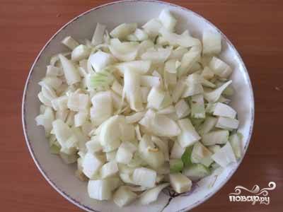 В глубокой сковороде нагреваем растительное масло и обжариваем в нем лук до легкого золотистого цвета.