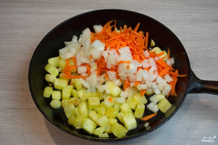 К подрумянившимся кабачкам добавьте нарезанные лук и морковь. Тушите все вместе 10 минут.