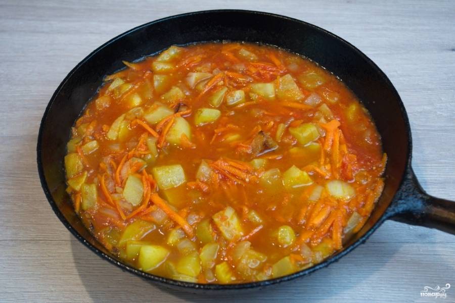 Влейте томатный сок. Тушите все вместе еще 15 минут.