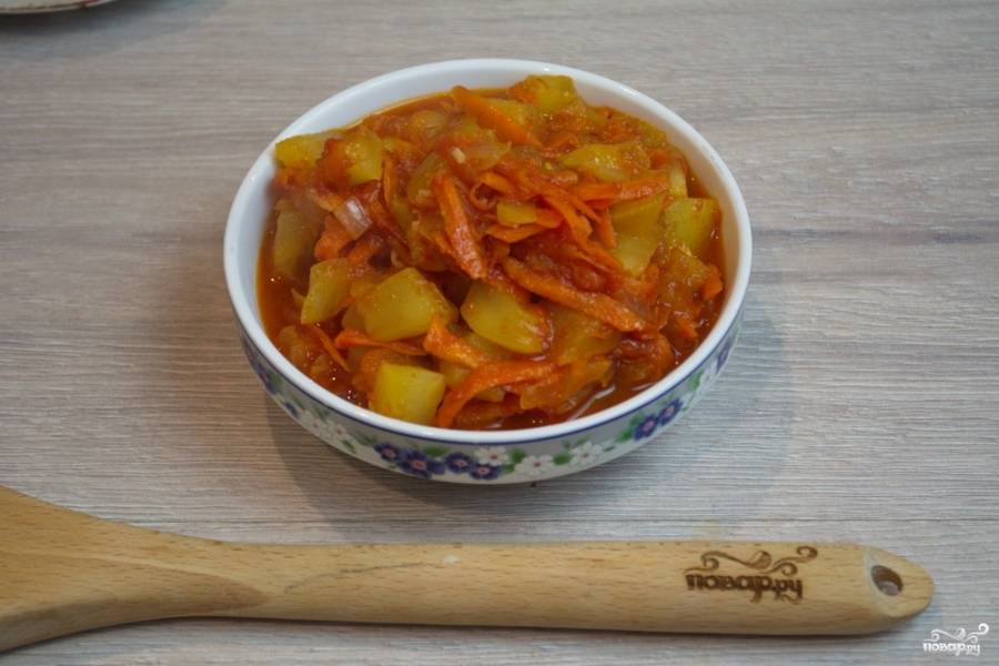 К икре добавьте соль, специи, немного сахара, чтобы погасить кислотность томата. Тушите до уваривания сока. Когда все овощи будут приготовлены, выключайте. Подайте кабачковую икру к столу. По желанию можете превратить икру в пюре при помощи блендера.