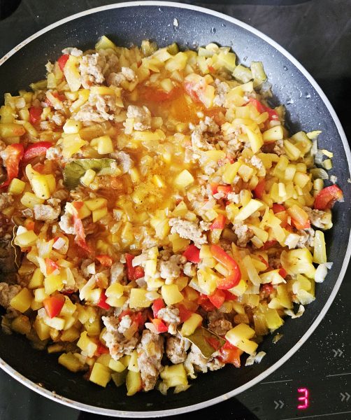 8. Затем в кастрюлю к овощам идут кабачки. Перемешайте и тушите всё 15 минут. Кабачки тоже должны стать мягкими.