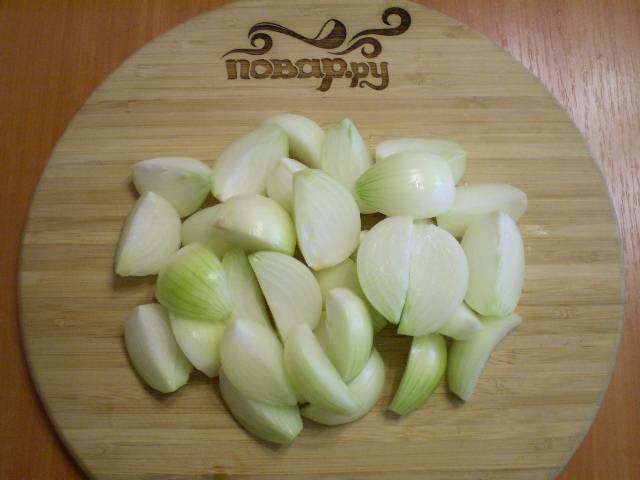 Порежьте лук на четвертинки, чтобы потом было удобно измельчать его.