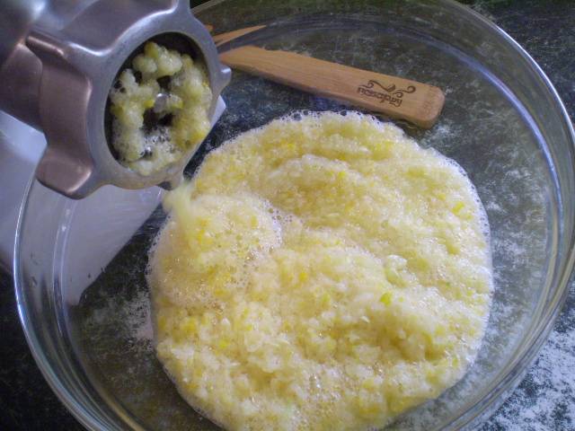 Пропускаем через самое мелко металлическое сито на мясорубке кабачки, лук и чеснок.