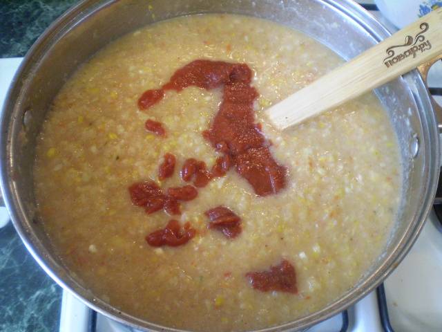 Также добавляем томатную пасту. Перемешиваем, варим еще 30 минут.