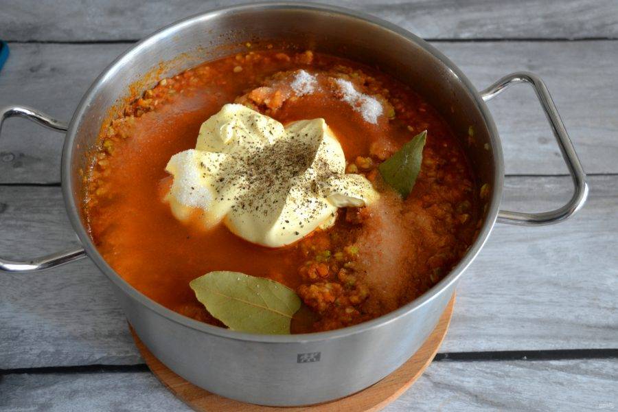Добавьте соль, сахар, лавровый лист, черный молотый перец. Тушите еще один час на среднем огне, помешивайте и проверяйте, чтобы икра не начала подгорать со дна.