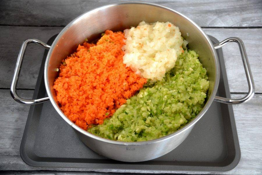 Измельчите все овощи в мясорубке. Выложите в кастрюлю с толстым дном.