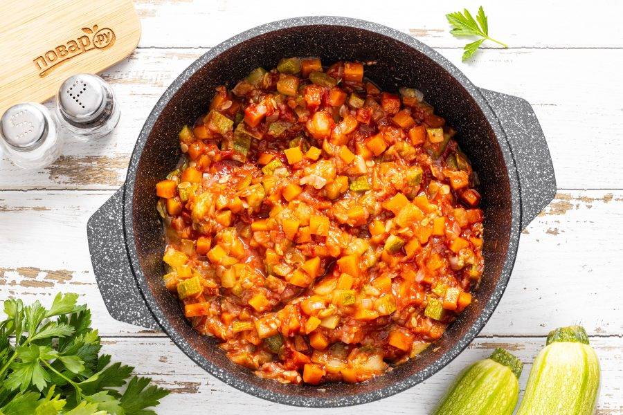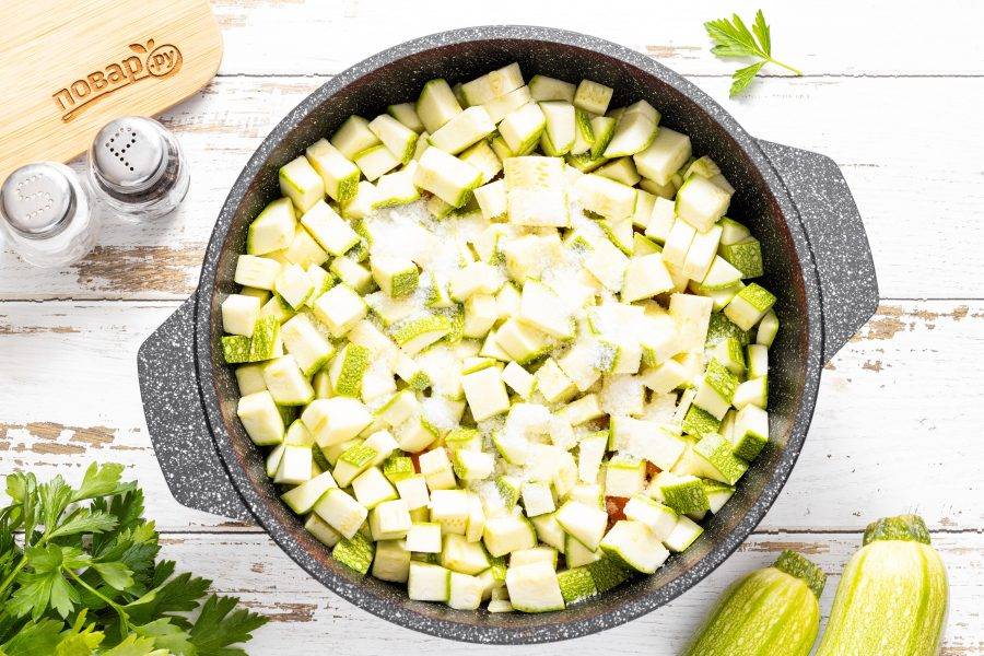 Затем добавьте кабачок. Приправьте сахаром и солью. Перемешайте и тушите под крышкой около 40 минут, периодически помешивая.