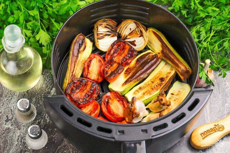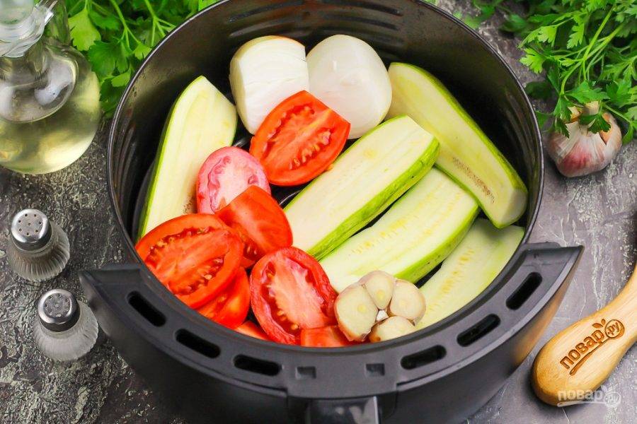 Выложите в чашу аэрогриля все овощные нарезки и сбрызните их растительным маслом. Срежьте верхушку головки чеснока и добавьте в чашу, не очищая его. Выставьте на таймере температуру в 180 градусов и запекайте овощи 20-25 минут в зависимости от их величины.