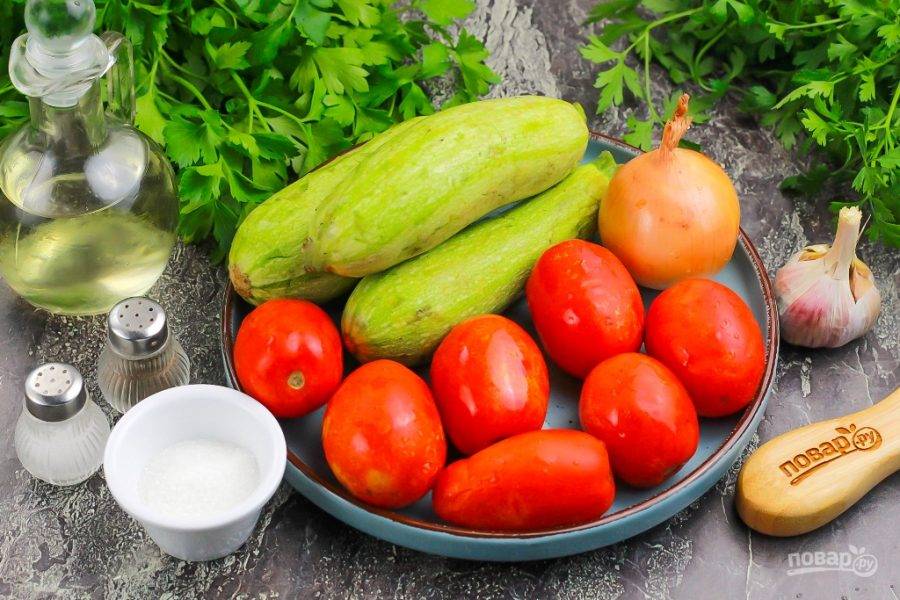 Подготовьте указанные продукты. Промойте кабачки и помидоры в воде, срежьте хвостики с кабачков и вырежьте зеленые сердцевинки у помидоров. Выбирайте кабачки мелкого или среднего размера без плотной кожуры и семян.