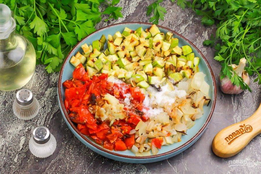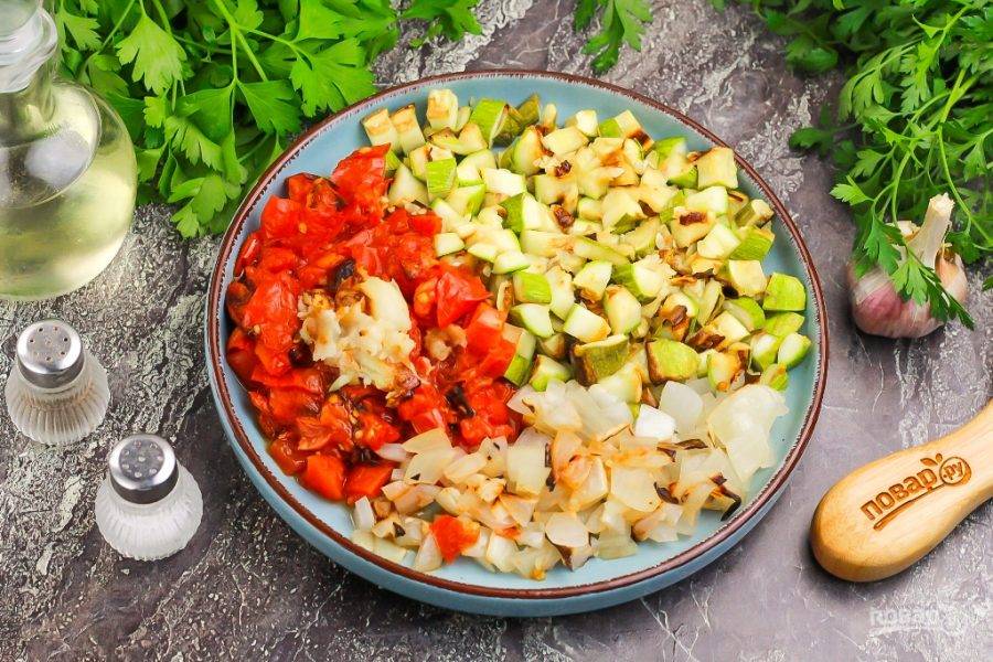 Нарежьте все запеченные овощи мелким кубиком, очистив лук и чеснок от шелухи.