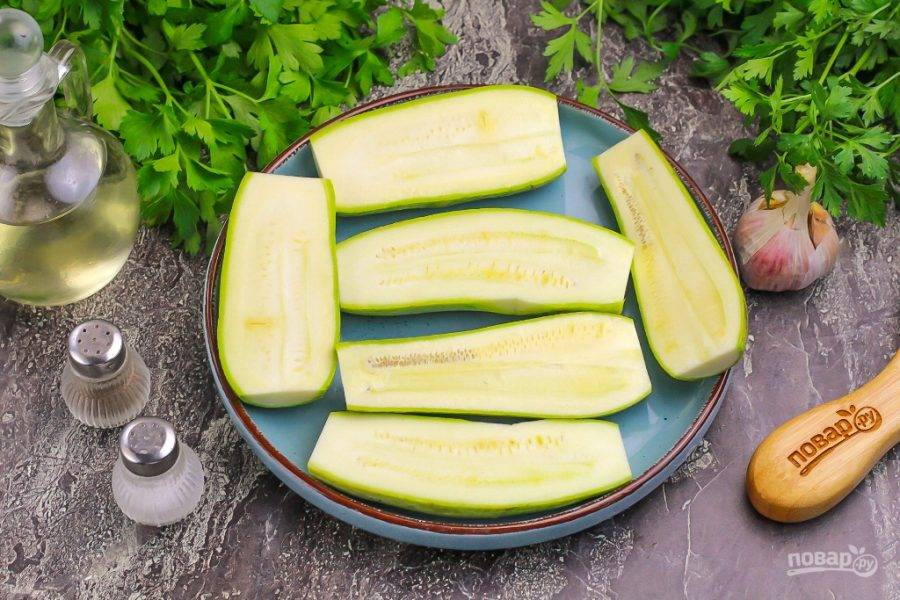 Разрежьте их вертикально пополам на две половинки. Можно нарезать и кольцами, но тогда придется запекать несколько раз все овощи.