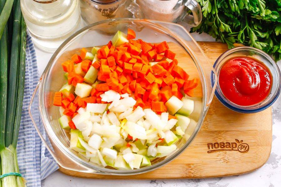 Подготовьте указанные ингредиенты. Кабачки приобретите молодые, без плотной кожуры и семян внутри. Все овощи очистите и промойте в воде.