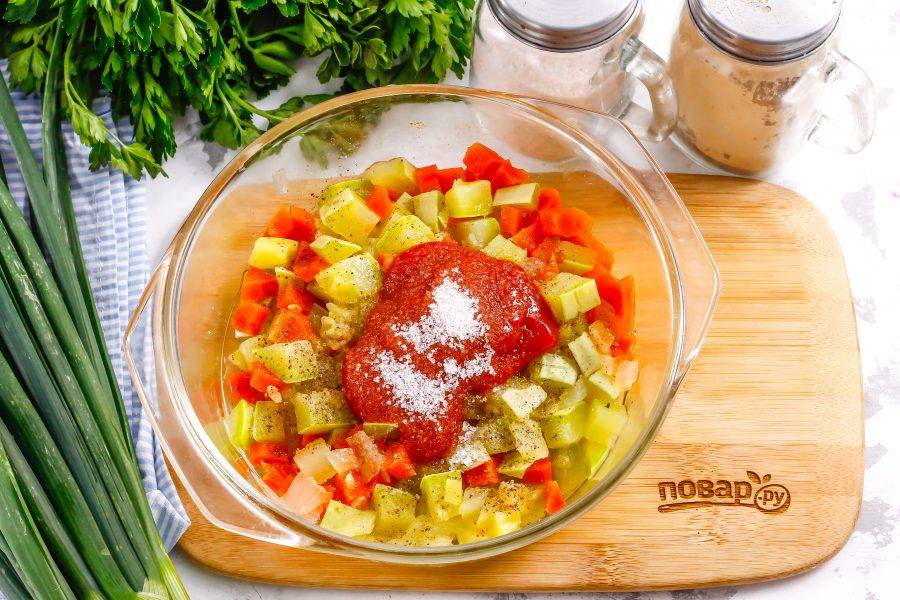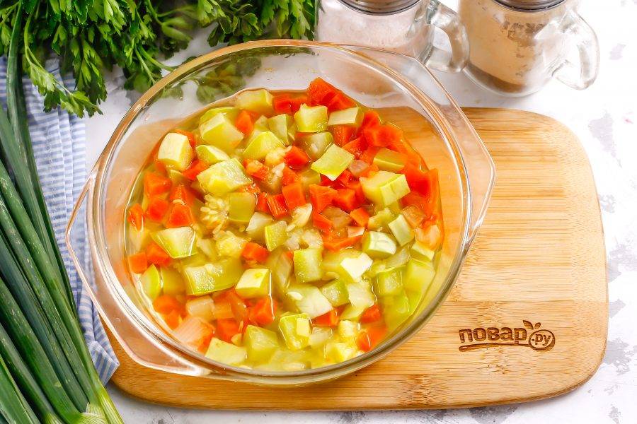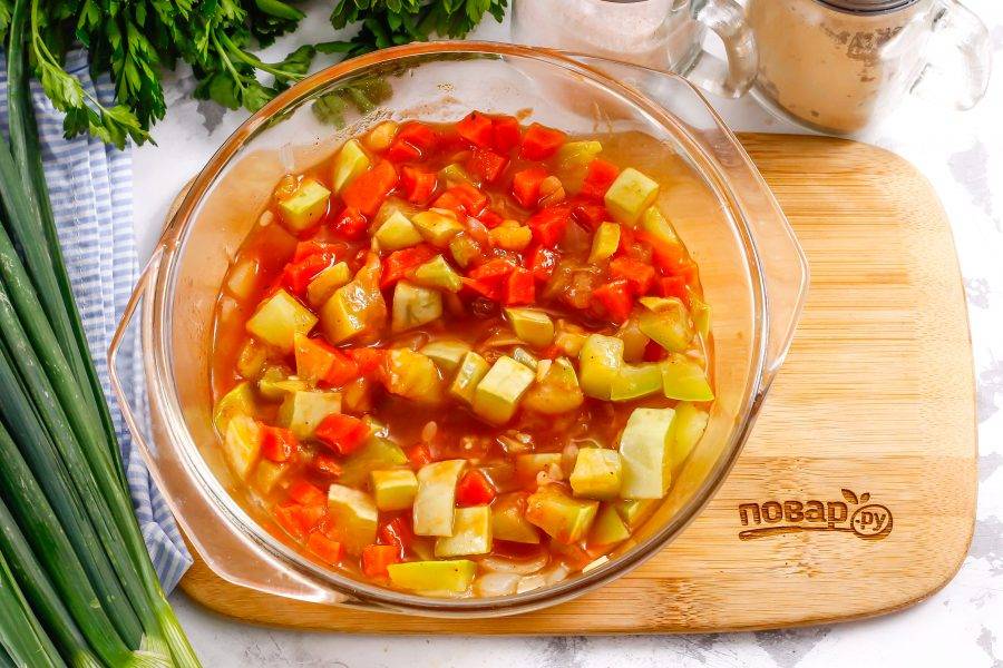 Овощи должны стать мягкими, пропариться, пропитаться томатным вкусом и ароматом.