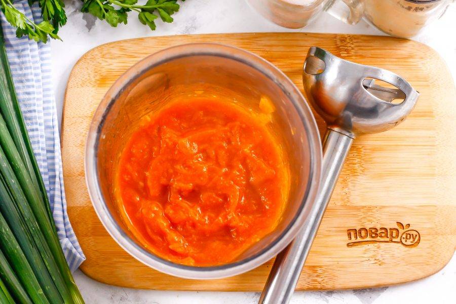 Переместите всю массу в глубокую емкость, измельчите с помощью погружного блендера, добавив спрессованный очищенный зубчик чеснока.