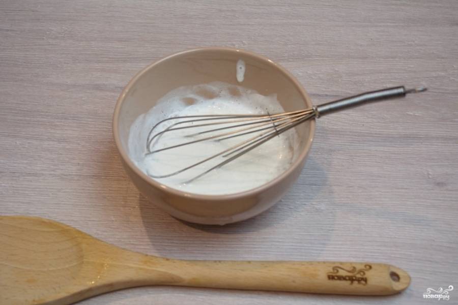 В тесто введите белки, вымешайте тесто ложкой. Мешайте не быстро, аккуратно складывая тесто. Вымешивать тесто нужно в одну сторону, чтобы взбитые белки не осели.