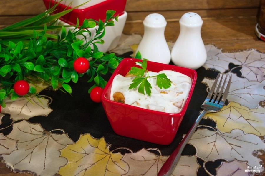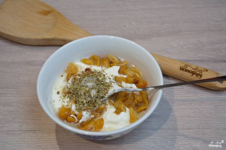 Разогрейте духовку до 200 градусов. Запекайте суфле в духовке 15-20 минут. Пока готовится суфле, мы приготовим соус. Для соуса следует смешать сметану, соль и специи, немного маринованных грибов. Я взяла опята. Массу перемешайте — и соус готов.