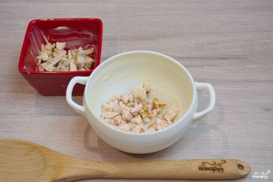 Формочки для запекания смажьте сливочным маслом. Я использую разные формочки, чтоб было понятно, что можно приготовить суфле даже в крепкой чашке. Отварное индюшиное филе нарезать кубиком. Уложить в формочки на дно.