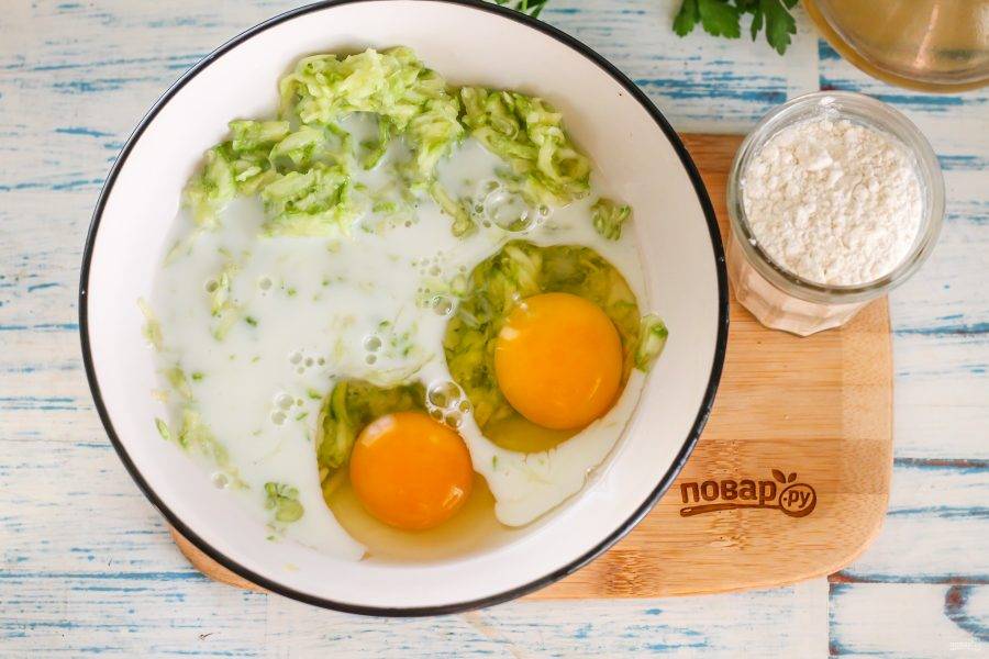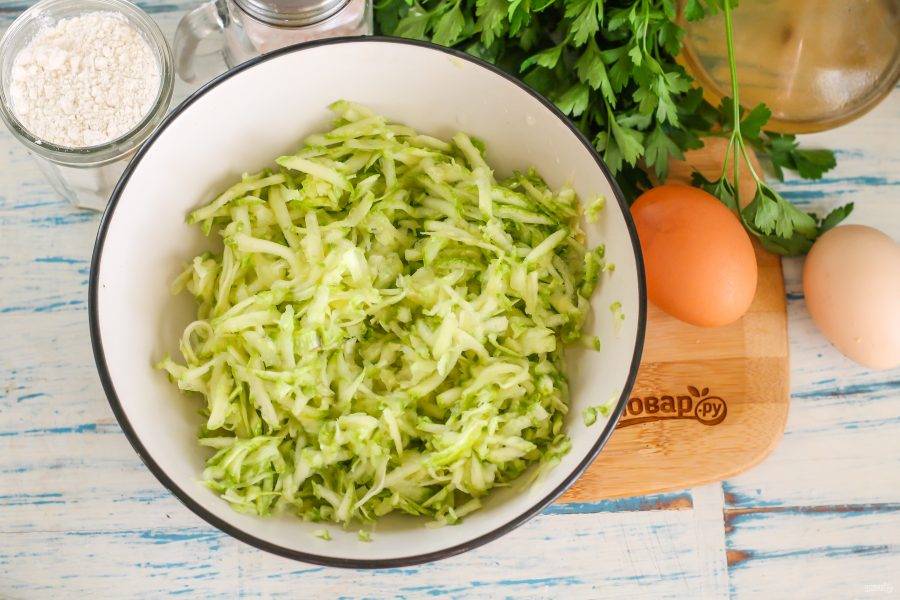 Кабачок промойте в воде, срежьте хвостики с обеих сторон овоща. Натрите плод на терке в глубокую емкость, всыпьте две щепотки соли и перемешайте. Оставьте на 5-6 минут, а затем отожмите массу от жидкости, иначе тесто не получится нужной консистенции.