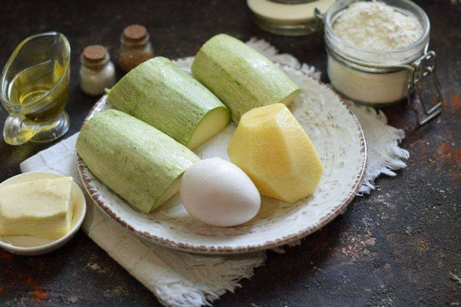 Следом очистите и сполосните картофель, натрите на мелкой терке, также добавьте к кабачкам. Теперь очень хорошо отожмите картофель и кабачки от лишней жидкости. Отжимайте руками.