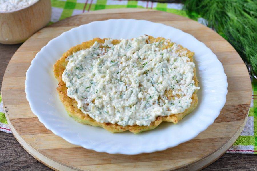 Разогрейте немного масла на сковороде, выложите пару ложек кабачкового теста и разровняйте, начните жарить коржи на среднем огне.