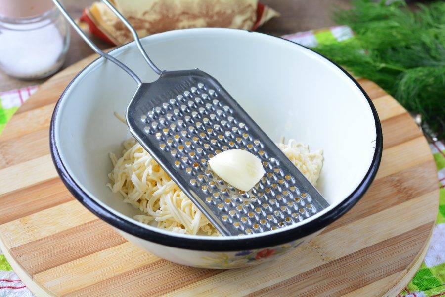 Туда же натрите чеснок. Чеснока кладите по вкусу. Чем больше чеснока, тем острее будет закуска.
