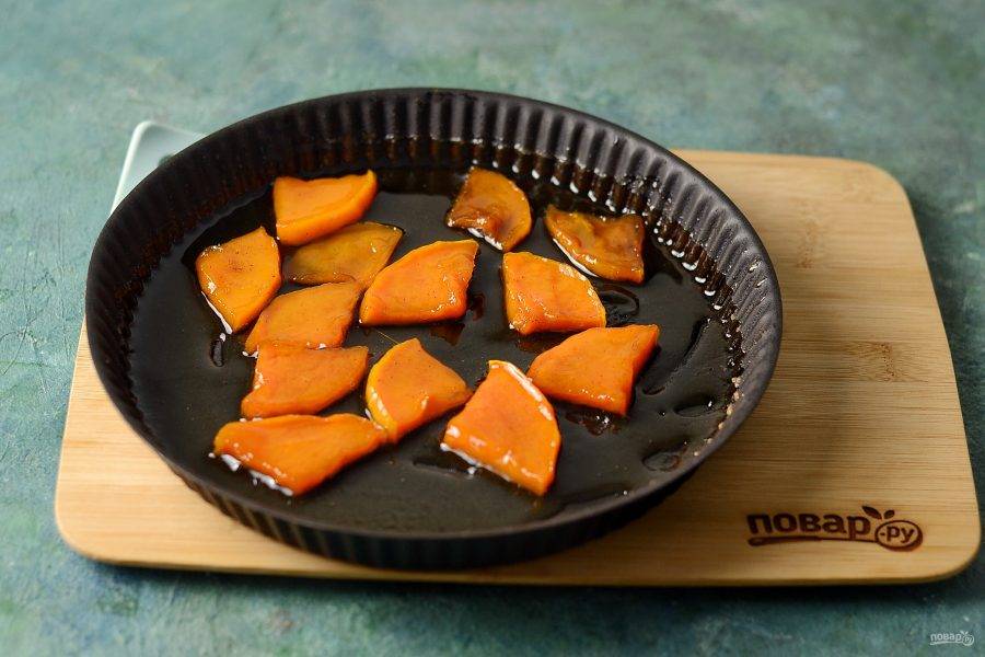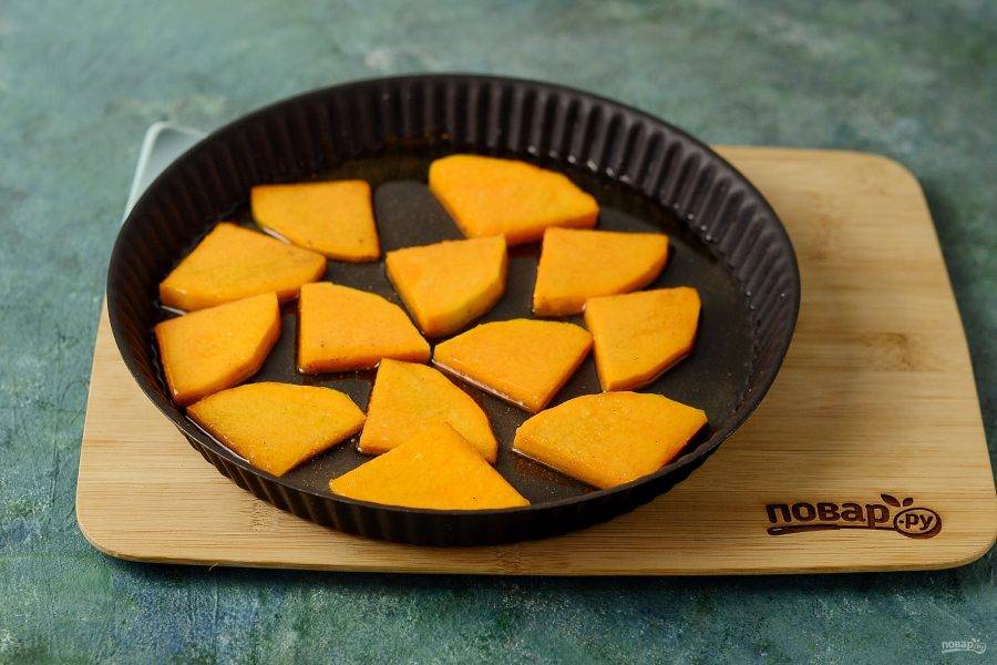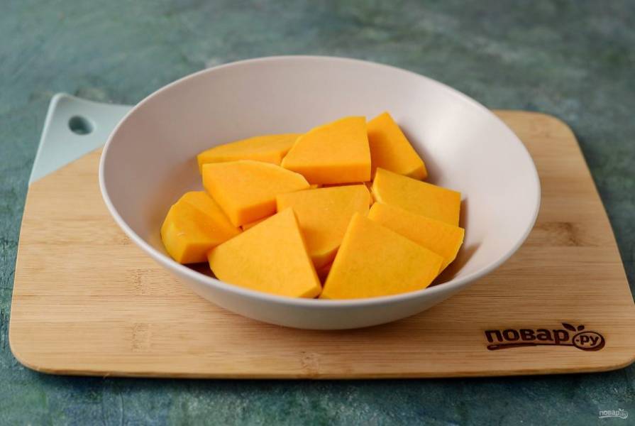 Тыкву очистите от кожуры, нарежьте на пластины одинаковой толщины.