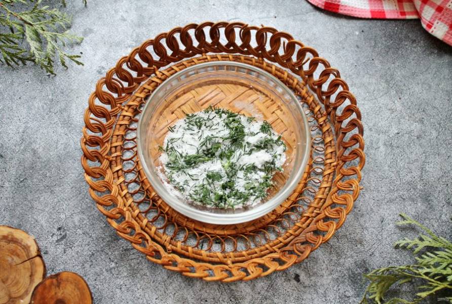 В чашке смешайте соль, сахар и мелко нарезанный укроп, перемешайте.