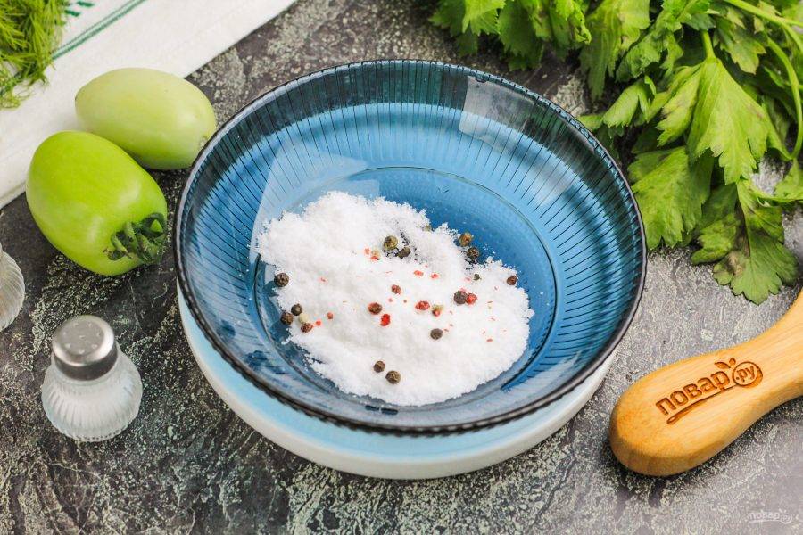 Всыпьте соль и горошины перца в пиалу или другую емкость и залейте холодной отфильтрованной водой. Тщательно размешайте, чтобы соль растворилась.