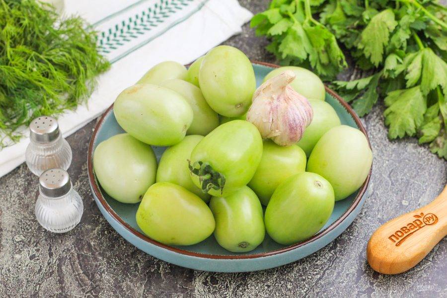 Подготовьте указанные продукты. Промойте зеленые помидоры в воде.