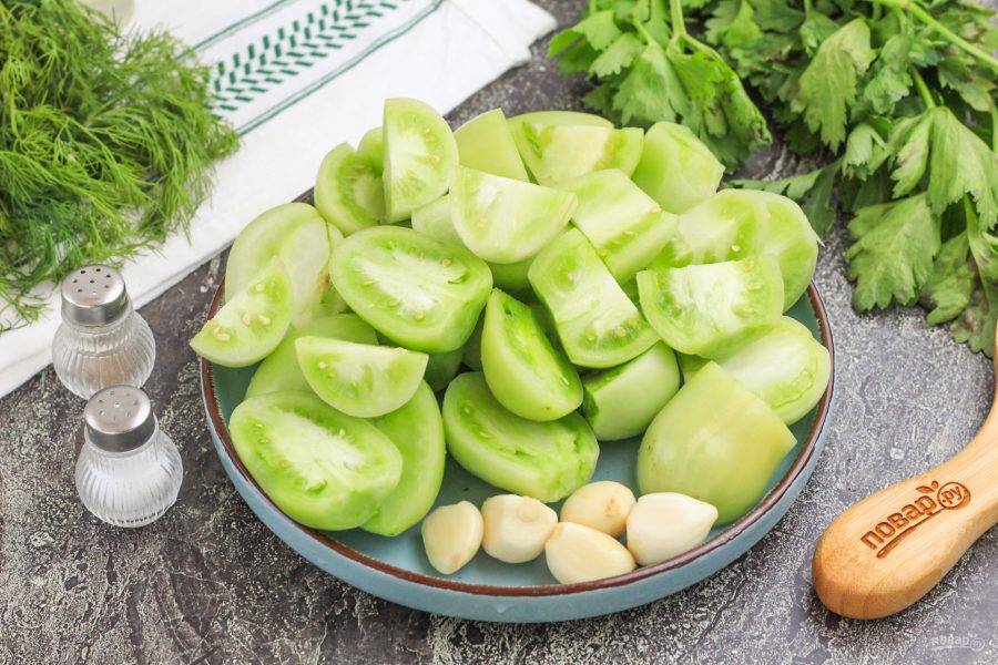 Вырежьте зеленые сердцевинки из помидоров и разрежьте их пополам или на четвертинки, если овощи крупные. Очистите чесночные зубчики от шелухи и промойте в воде.