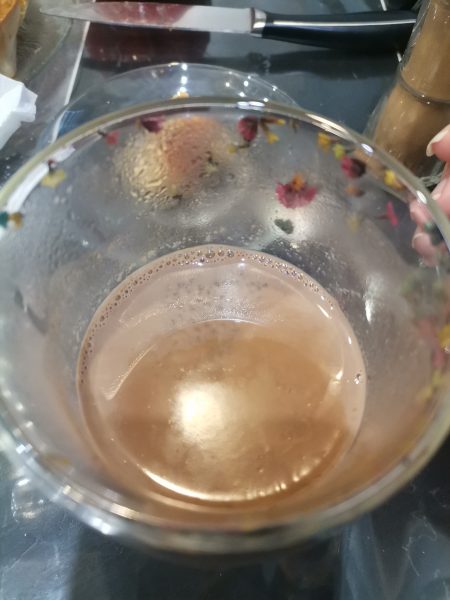 Убавьте огонь на минимальный и доведите напиток почти до кипения. Интенсивно перемешайте венчиком и снимите с плиты.