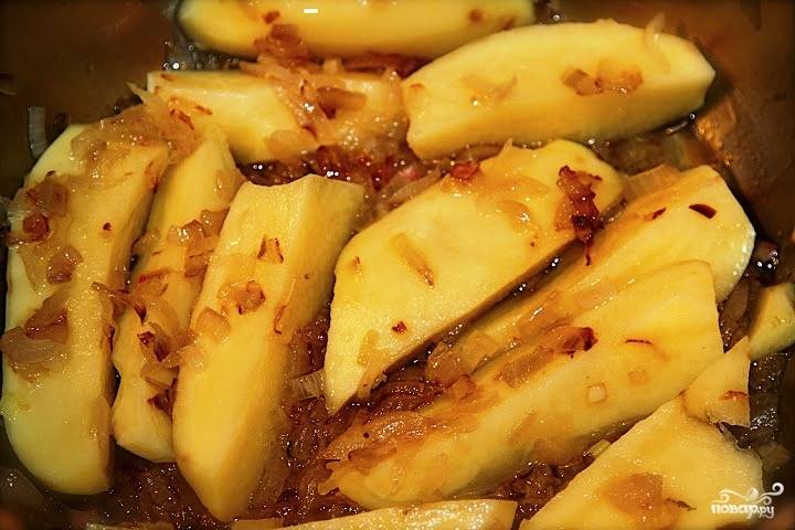 Добавляем картофель в сковороду к луку и, помешивая, обжариваем еще 10 минут.