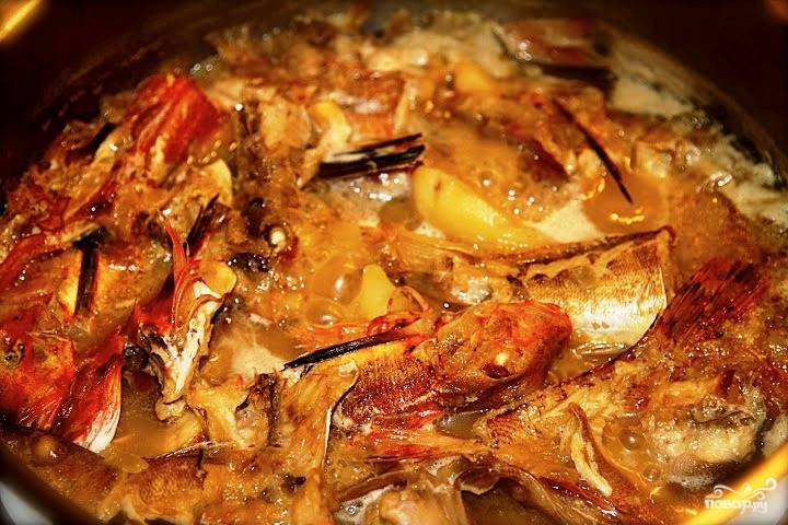 Кладем кусочки рыбы в кастрюлю, в которой обжаривались лук с картофелем.