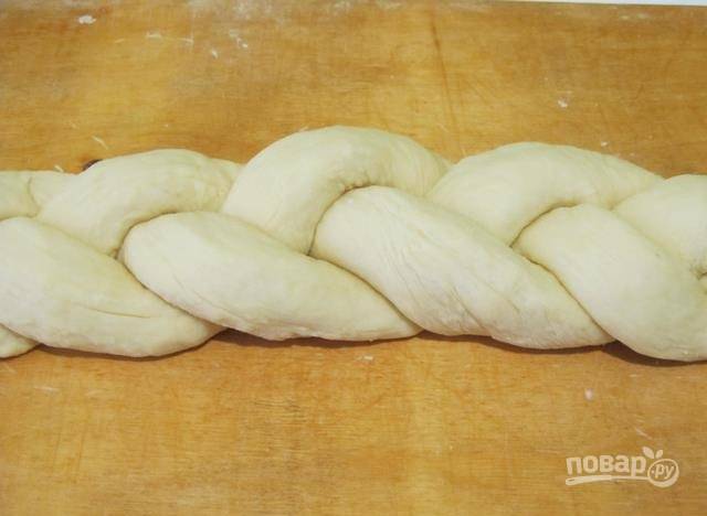 7. Маленькие кусочки теста сформируйте воедино, затем раскатайте из них один жгут. Косичку, что сплели из больших кусочков уложите по кругу и обмотайте тонким ободком теста.