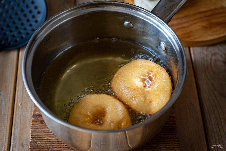 В сотейнике разогрейте на среднем огне растительное масло и аккуратно опустите часть заготовок — обжарьте их со всех сторон до увеличения в объеме и появления аппетитного золотистого оттенка.
