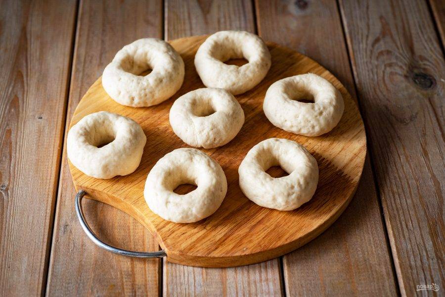 От теста отделяйте небольшие части (вес примерно 60 грамм), сначала скатайте из них шарики, а затем продавите в каждом отверстие и расширьте его, формируя заготовки калачиков.