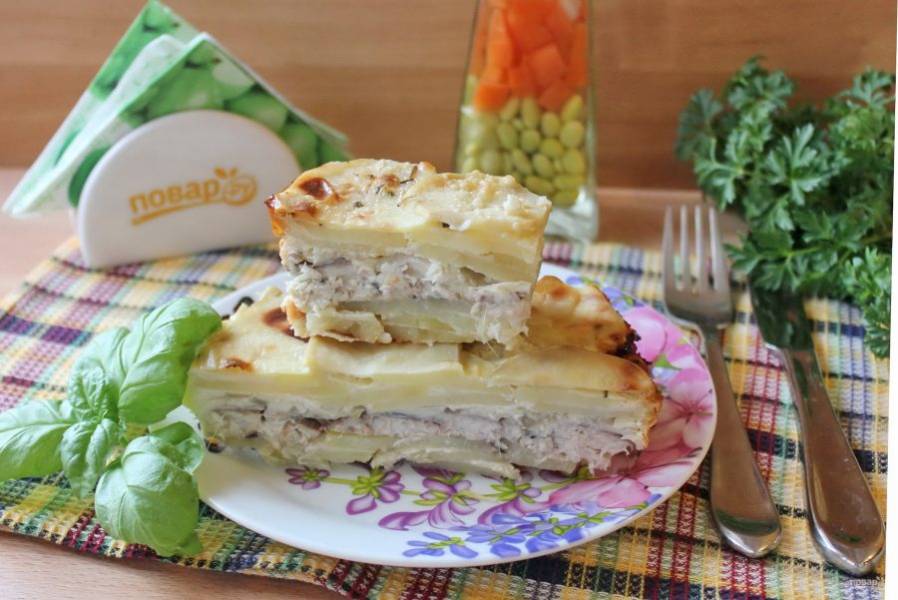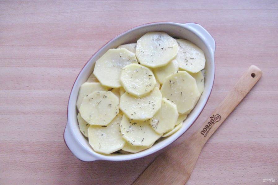 Картофель очистите, помойте и нарежьте пластинками. Половину картофеля выложите в форму для запекания. Посолите и поперчите по вкусу.