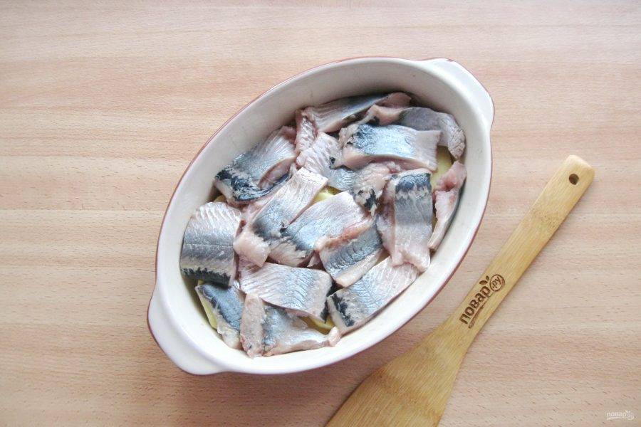 Филе сельди нарежьте небольшими кусочками и выложите на слой картофеля. Немного посолите.