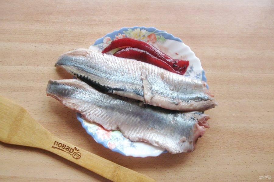 Мороженую сельдь разморозьте. Удалите голову и плавники. Разрежьте на две части вдоль и достаньте хребет. Уберите крупные кости. Должно получиться два филе.