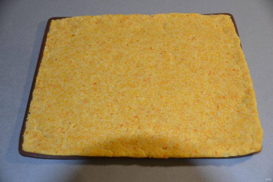 Выложите миндальную смесь на противень с бортиками и начинайте плотно утрамбовывать.