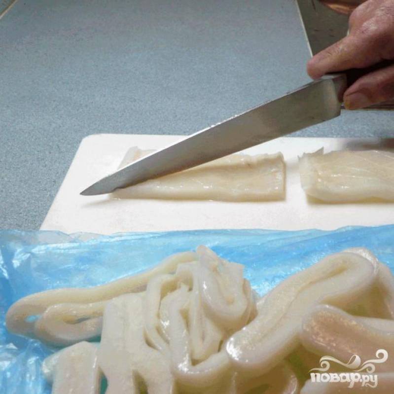 Вставьте нож в трубчатого кальмара, сделайте разрез с одной стороны (вдоль) и откройте морепродукт, чтобы сделать плоские листы. Используя кончик ножа сделайте надрезы на внутренней стороне листов (не насквозь) на расстоянии 1 см друг от друга по диагонали. Разрезать лист кальмара пополам, а затем поперек для того, чтобы получились 4 прямоугольника. Нарезать все получившиеся кусочки на 8 треугольников. Замочите морепродукты в молоке с кусочками киви минимум на 30 минут (лучше на ночь). Киви имеют в себе фермент, который воздействуя на белки кальмара размягчает его.