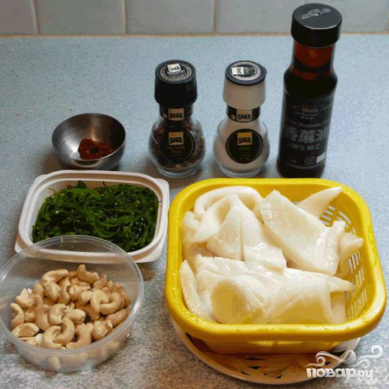 Слить воду и промыть треугольники. Нагреть масло в сковороде с толстым дном. Выложить кальмары в сковороду. Сразу же добавить соль и чили пасту. Обжаривать кальмары в течении 3 минут, переворачивая пару раз. Добавить орехи Кешью. Выложить салат Вакамэ в блюдо, поверх положить морепродукты с орешками. Подавать сразу же.