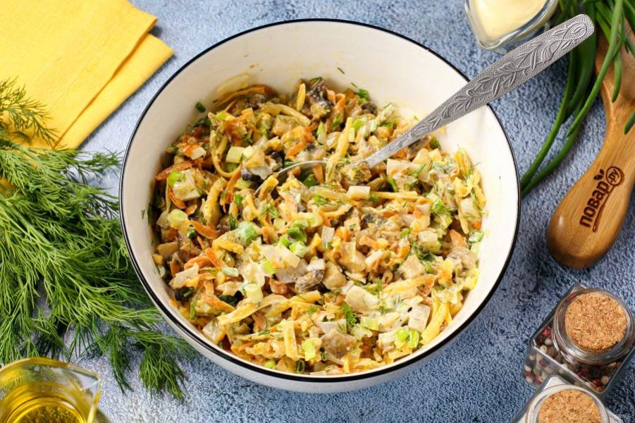 Обжарьте грибы с овощами в течение 5 минут. Снимите сковороду с плиты и дайте немного начинке остыть.