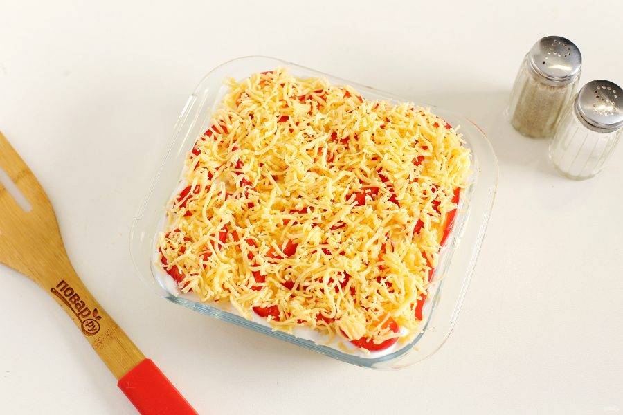 Посыпьте перец тертым сыром и запекайте в разогретой до 180 градусов духовке до образования румяной корочки.