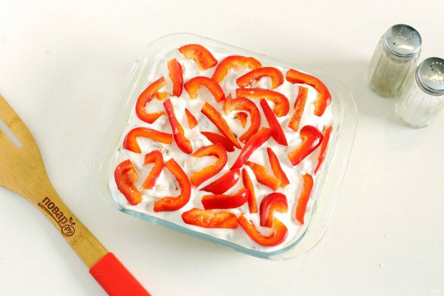 Залейте все сметаной и сверху распределите нарезанный соломкой перец.