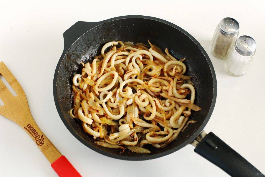 Обжарьте лук до золотистого цвета, добавьте нарезанные соломкой кальмары, посолите и поперчите по вкусу.